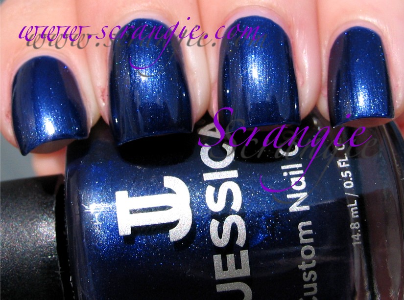 Majesty Blue. Jessica does some pretty fabulous blues, and this is one of the most fabulous. The base color is common- deep midnight blue shimmer- but what makes this one special are the large shimmer flecks that flash green through the blue base. Click on the indoor picture to enlarge and check out the little speckles of glitter/shimmer!